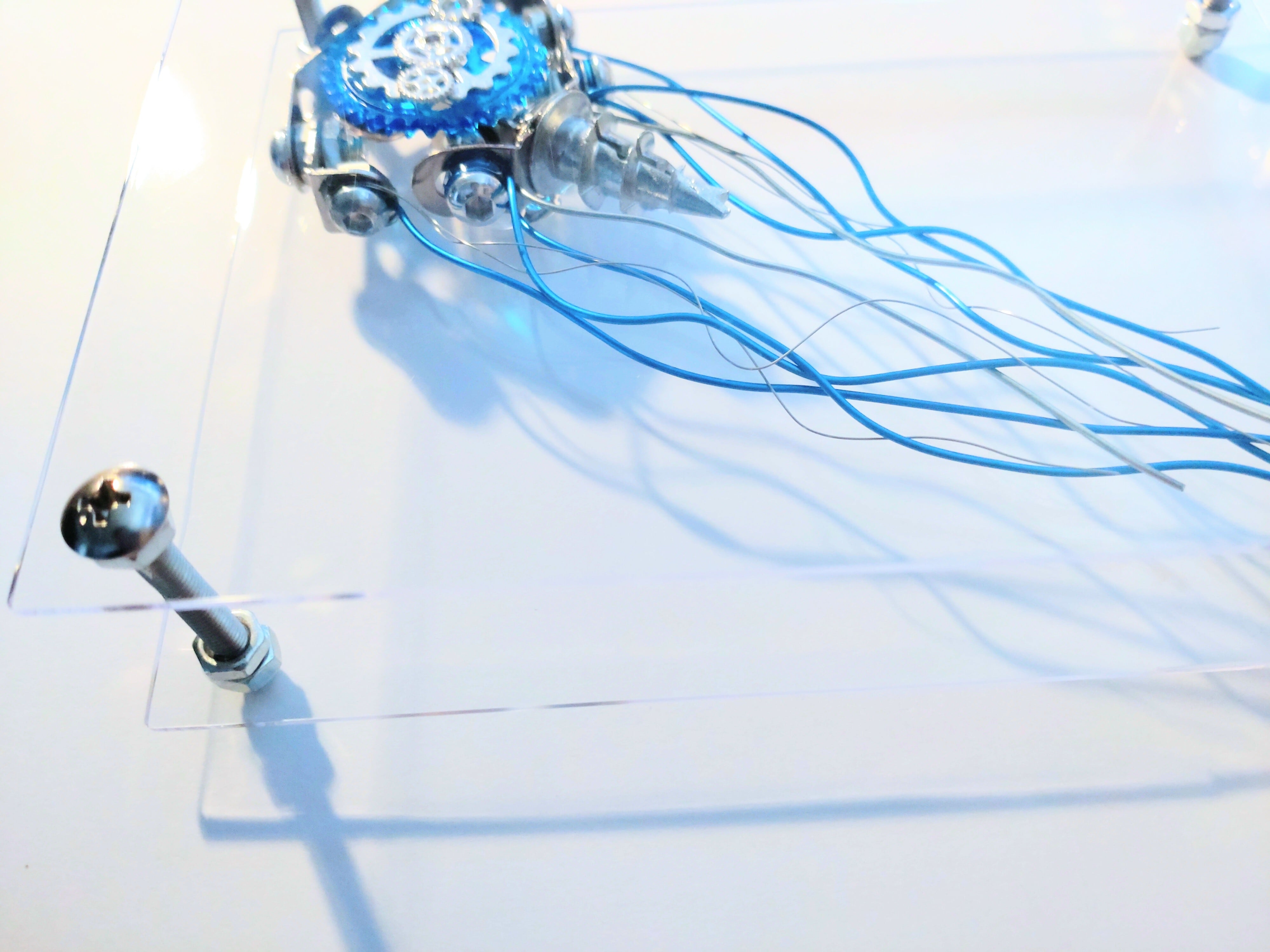 【受注生産】縦9cm✕横13cm✕奥4cmのアクリルパネルオブジェです。アクリルにはメタルパーツで作ったクラゲが接着されておりアクリルでサンドしているため自立が可能です。